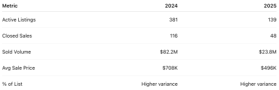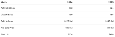 Single-family homes remained the market’s primary driver, though conditions moderated from 2024. Inventory increased about 10%, and sales activity rose modestly. Total sold volume and average prices declined, signaling a normalization after peak pricing. Homes that were well-priced and move-in ready sold efficiently, while over-priced listings experienced longer market times.