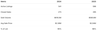 The condominium market strengthened in 2025, supported by increased transaction volume and higher overall sales dollars. Inventory rose modestly, while closed sales increased over 20%, indicating improved absorption. Although average sale prices dipped slightly, total sold volume climbed meaningfully, driven by higher-end units. Percent of list price softened marginally, reflecting healthy negotiation rather than distress.